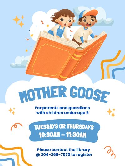 Join us for stories, songs and games at our Mother Goose Program! We have 2 sessions a week available, Tuesdays from 10:30am-11:30am OR Thursdays 10:30am-11:30am. There is limited space so please contact the library to register. If your preferred session is full we can add you to a waitlist.